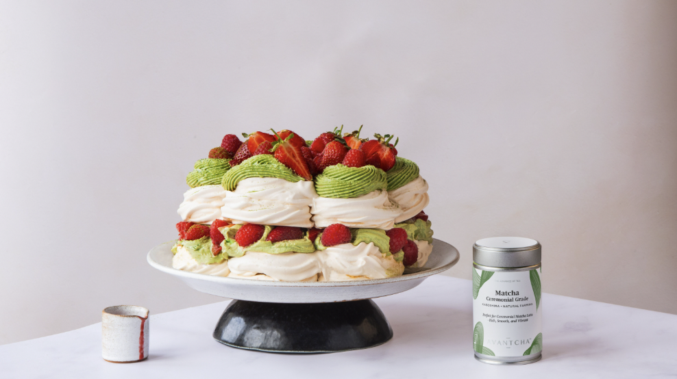 Two-layer pavlova with made with Organic Matcha Cocktail Grade Kagoshima, crisp meringue, and fresh berries. Read the recipe.