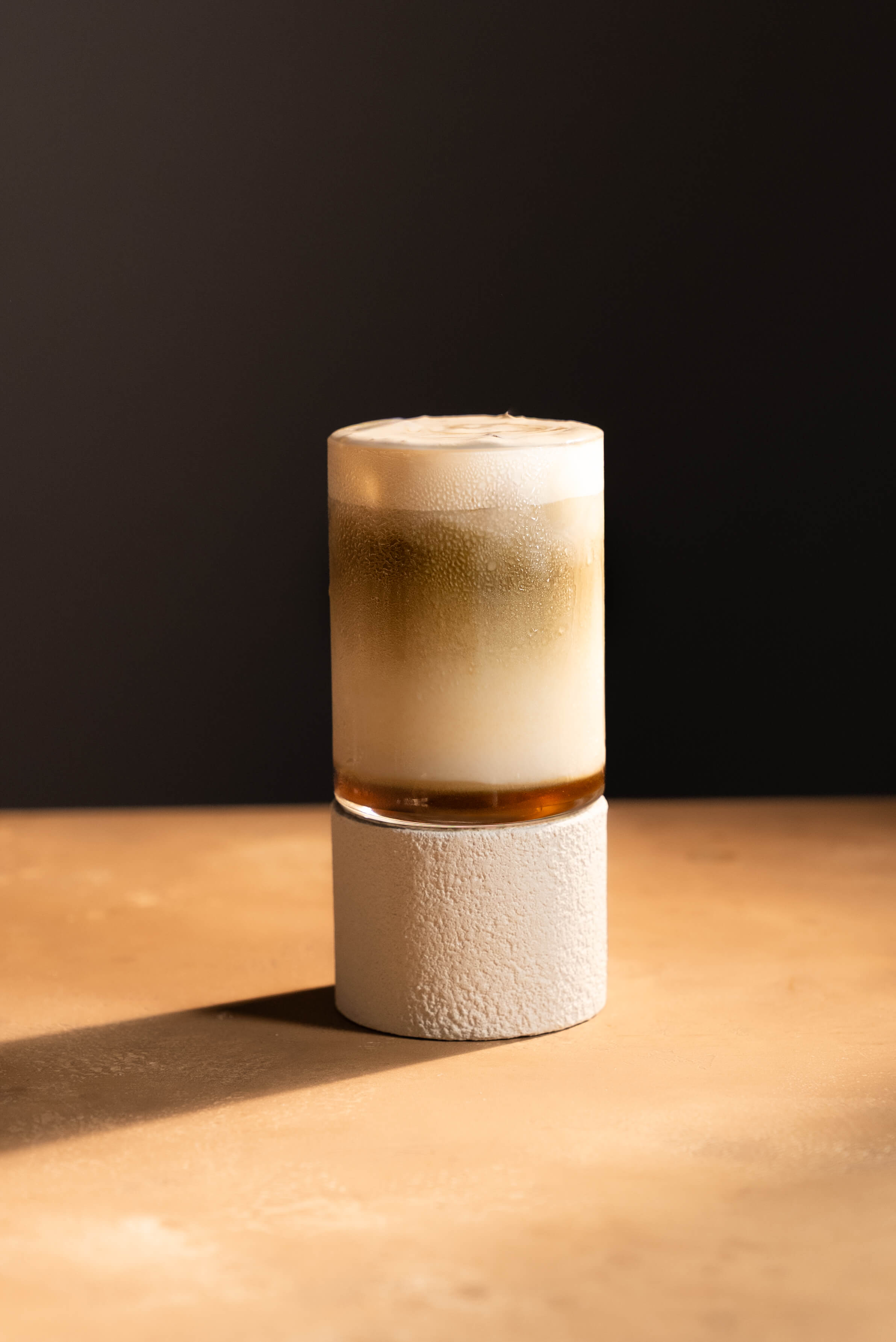 1. Start by making the salted maple cream: add 50ml of double cream, 20ml of milk, 15ml of maple, and pinch of salt into a mixing glass. Whisk until thick but still pourable. Keep in the fridge until ready to use.